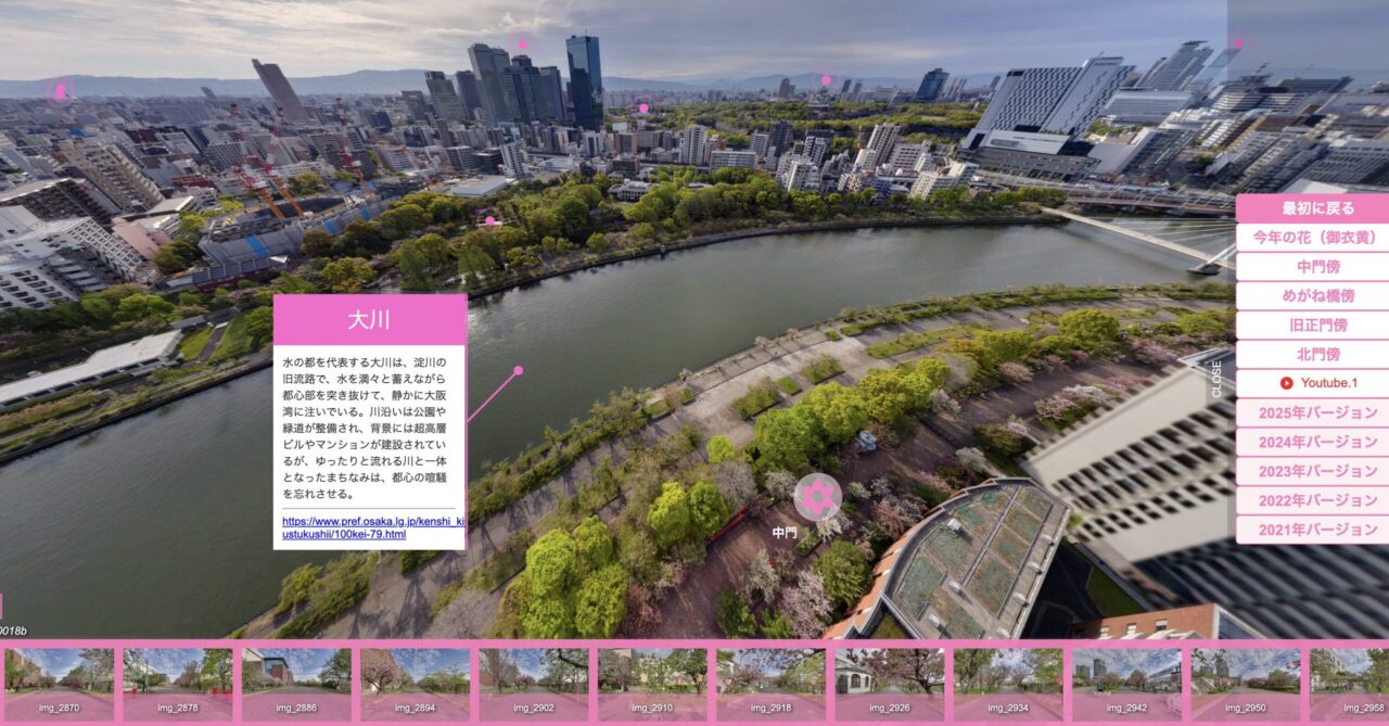 造幣局の桜の通り抜けは、南から北へ通り抜けを行いますが、地上からの眺めですが、ドローンを使って、桜の上から撮影しているので、普段見れない、風景を味わえます。